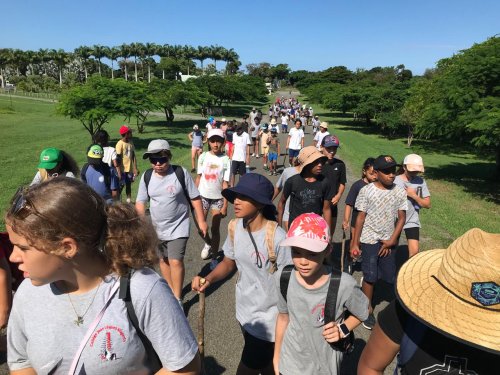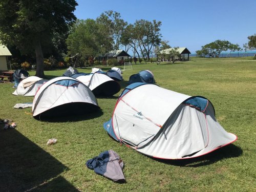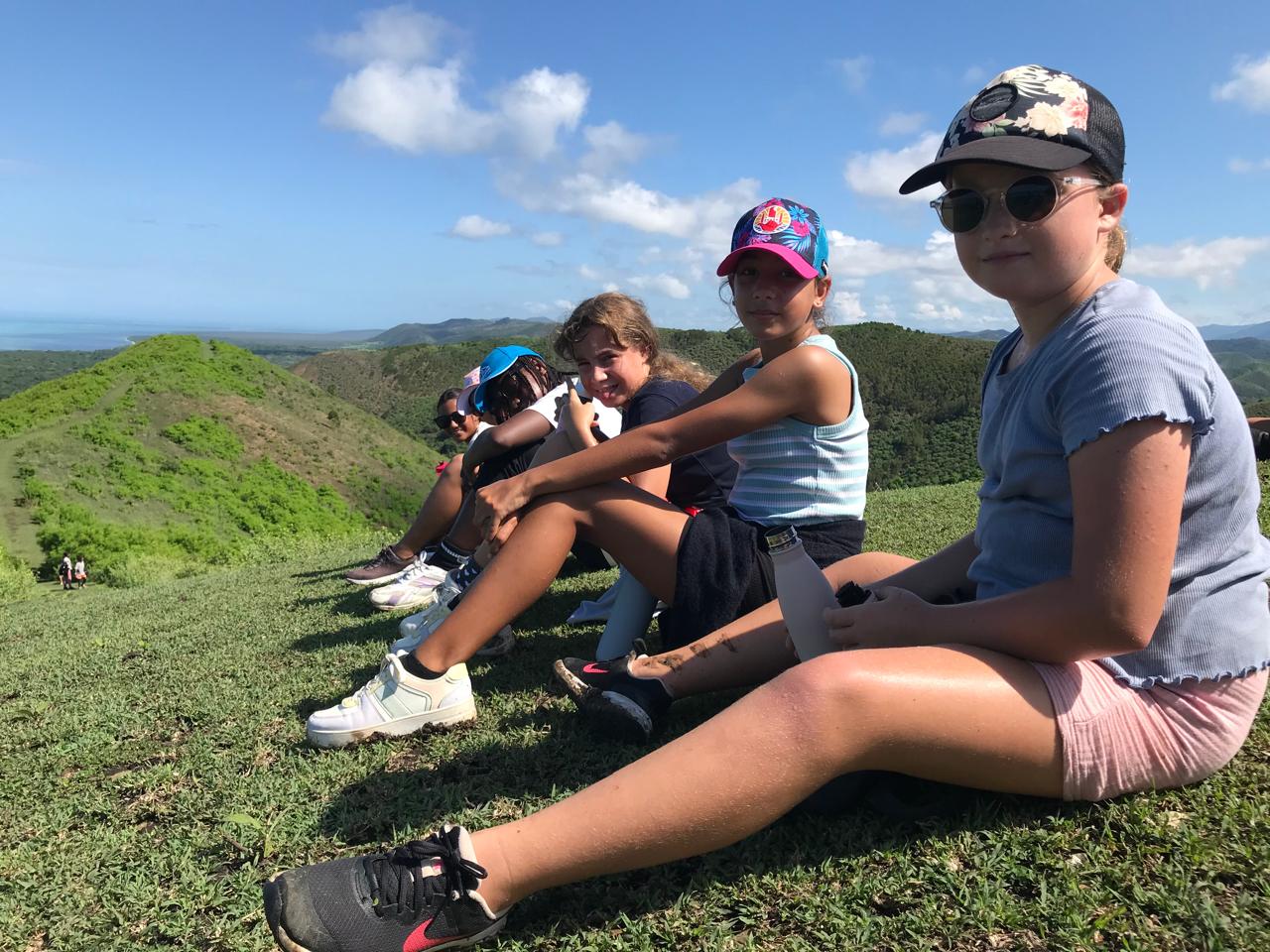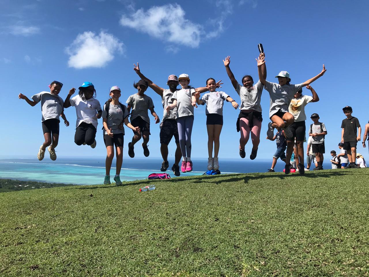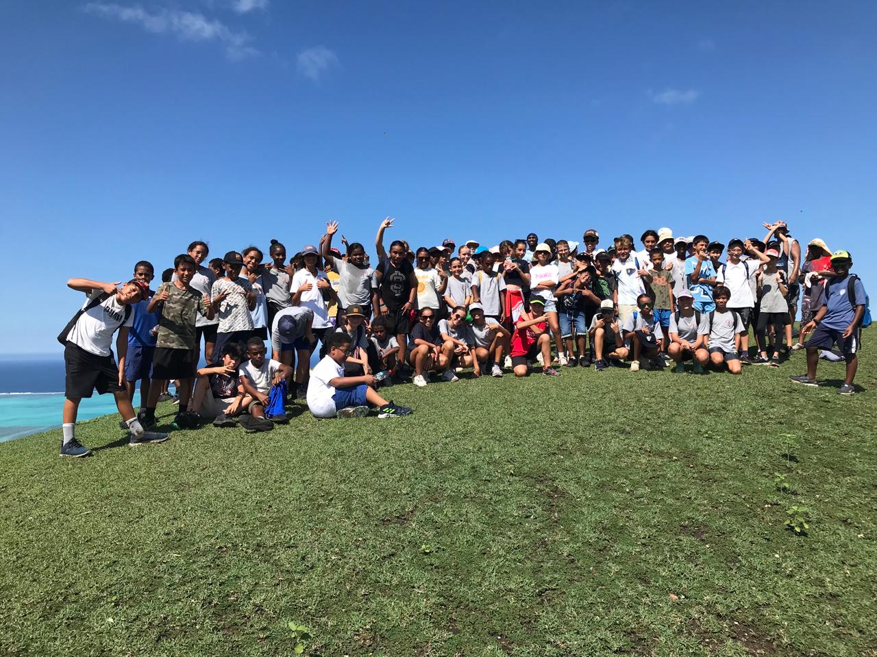 Le dernier jour ; alors qu’une légère fatigue se fait ressentir, il faut accélérer. Dès 6 heures ce matin, brans-le-bas de combat dans les dortoirs. Chacun émerge, puis range ses affaires, tire ses draps du lit, passe un coup de balai. Le petit déjeuner et hop la crème sur le nez, le couvre-chef enfoncé, gourde à la main, basket au pied, on attaque la montagne. En réalité le Oua Koué culmine à 160m d’altitude, et nos élèves n’en feront qu’une bouchée. Les petits efforts de la montée sont vite récompensés par une vue plongeante à 360° ; un paysage à couper le souffle. Les bleus du lagon côtoient la luxuriance des montagnes bien arrosées ces derniers temps. Le groupe se scinde alors, les plus valeureux se lancent sur le tour complet, plus prudents les autres font demi-tour. A l’arrivée, démontage des tentes, pliage des matelas pneumatiques, rangements ultimes, tout le monde met la main à la patte, il ne faudrait surtout pas croire que nous sommes en vacances  !!!!! Encore un déjeuner délicieux et copieux, mais gare à ne pas trop remplir les panses, les bus sont là, le voyage retour imminent. Quelques heures nous séparent des retrouvailles. Tout le monde arrive enfin sans dommages, merci à toute la communauté pour cette belle expérience !